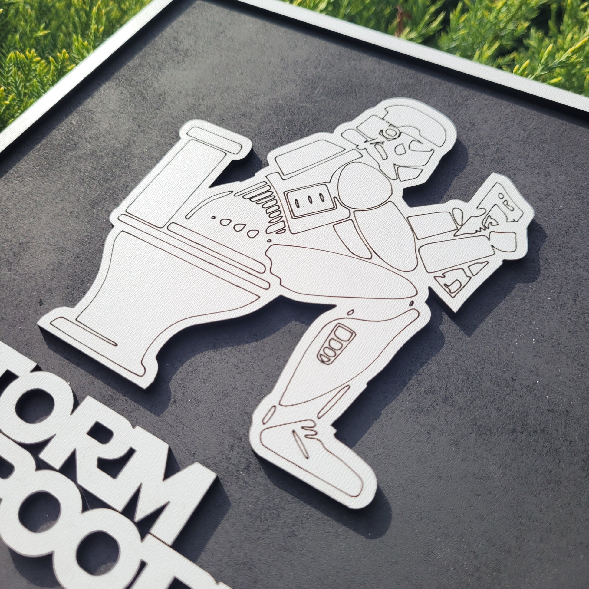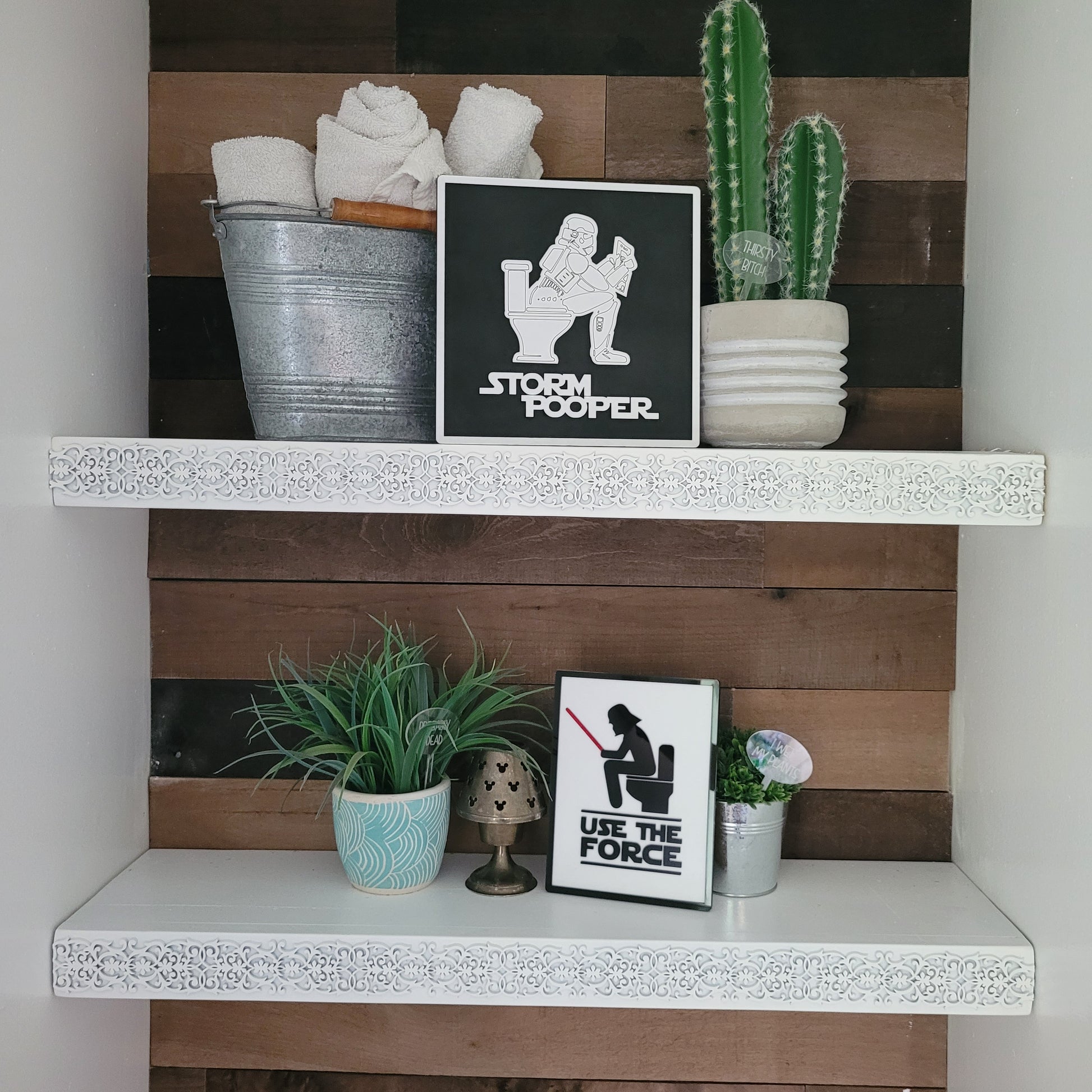 Ajoutez une touche d'humour à votre salle de bain avec notre décoration Star Wars ! Chaque pièce est réalisée en acrylique et MDF de 3,2 mm (1/8"), avec matériel de suspension ou support inclus. Très légères, elles peuvent facilement être suspendues ou posées sur une étagère grâce à nos supports, fabriqués sur demande ! Support gratuit.