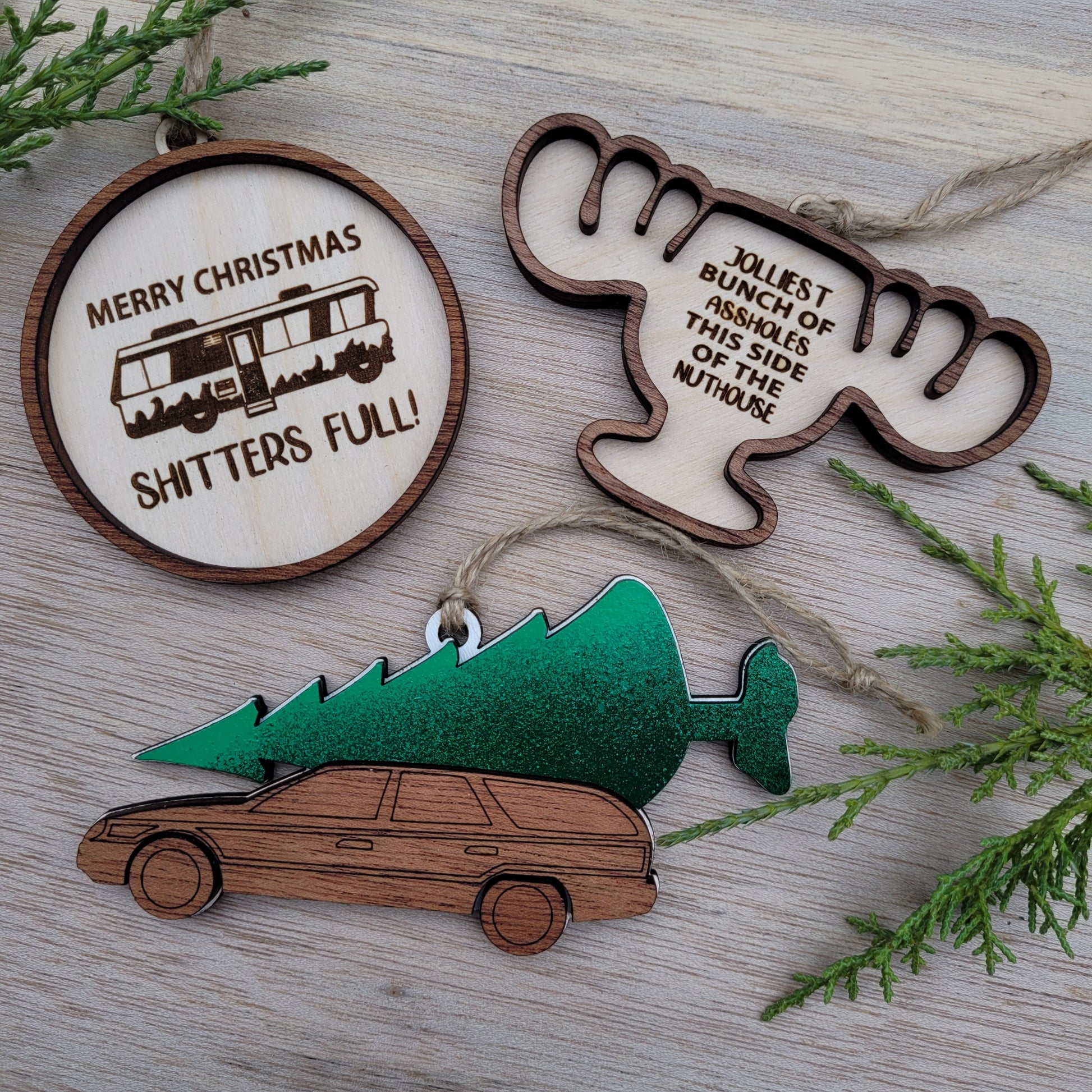 Combining the hilarious quote from Clark Griswold and his Wally World moose cup brought together two iconic things from this 80's classic, National Lampoons Christmas Vacation. Created with Baltic Birch and Cherry layers. Measures approx 4.25" x 3".