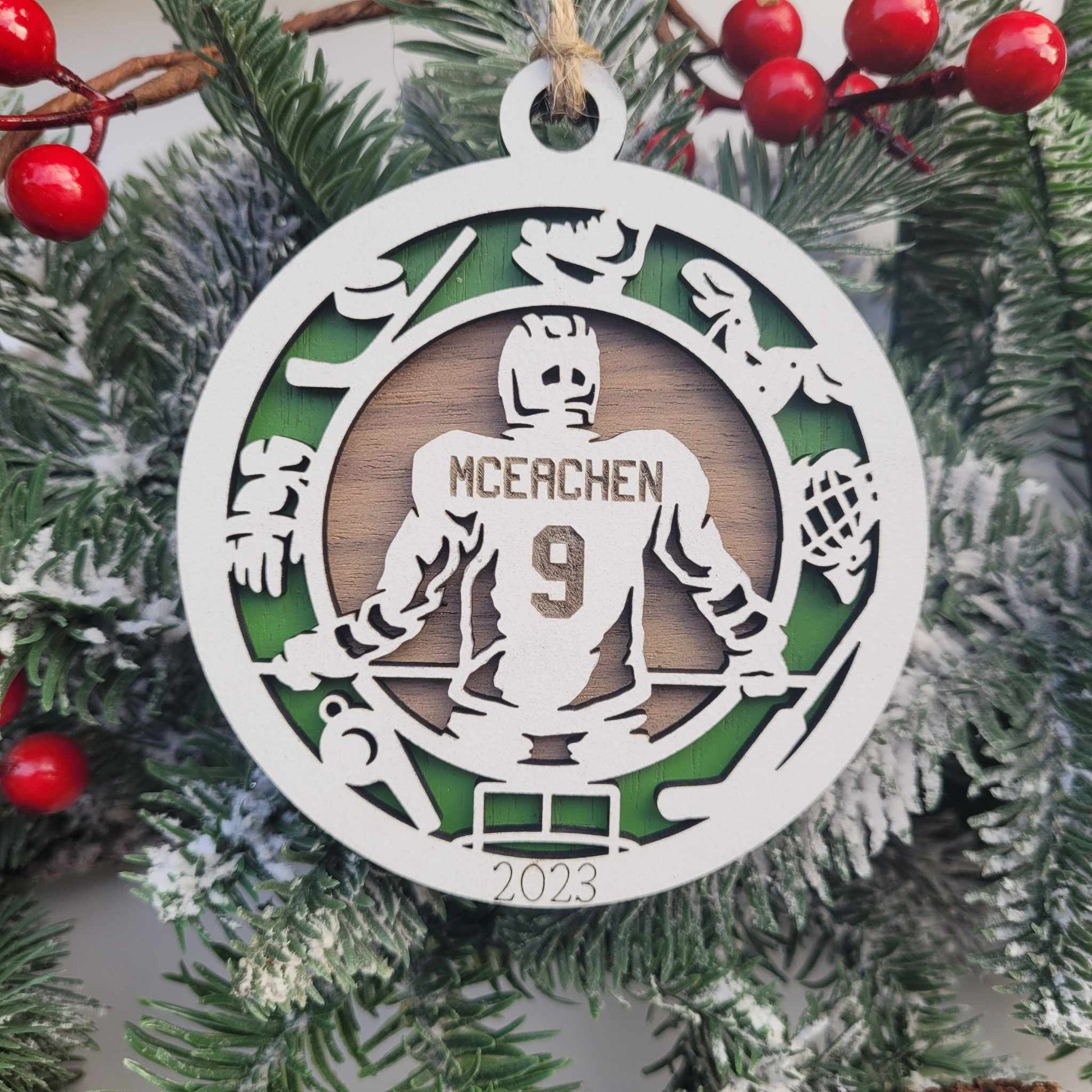 Are you looking for something unique for your hockey player or hockey team this year? Customized hockey ornament options are available for both male and female options. Each ornament has a base of 1/4" walnut, along with a peek-a-boo trim of the classic Nanaimo Clippers green. Team colours available upon request, green by default. Personalize the top layer with your players last name, number and the year.
