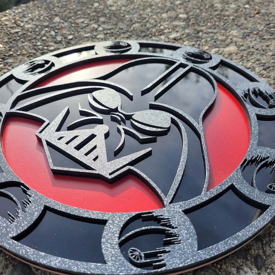 Join us on the Dark Side! This 12" circular masterpiece is perfect for adding some flair to a kid's room or gamer's den. Meticulously crafted with glossy black acrylic, hand painted silver layers and top-notch 1/8" Baltic birch.