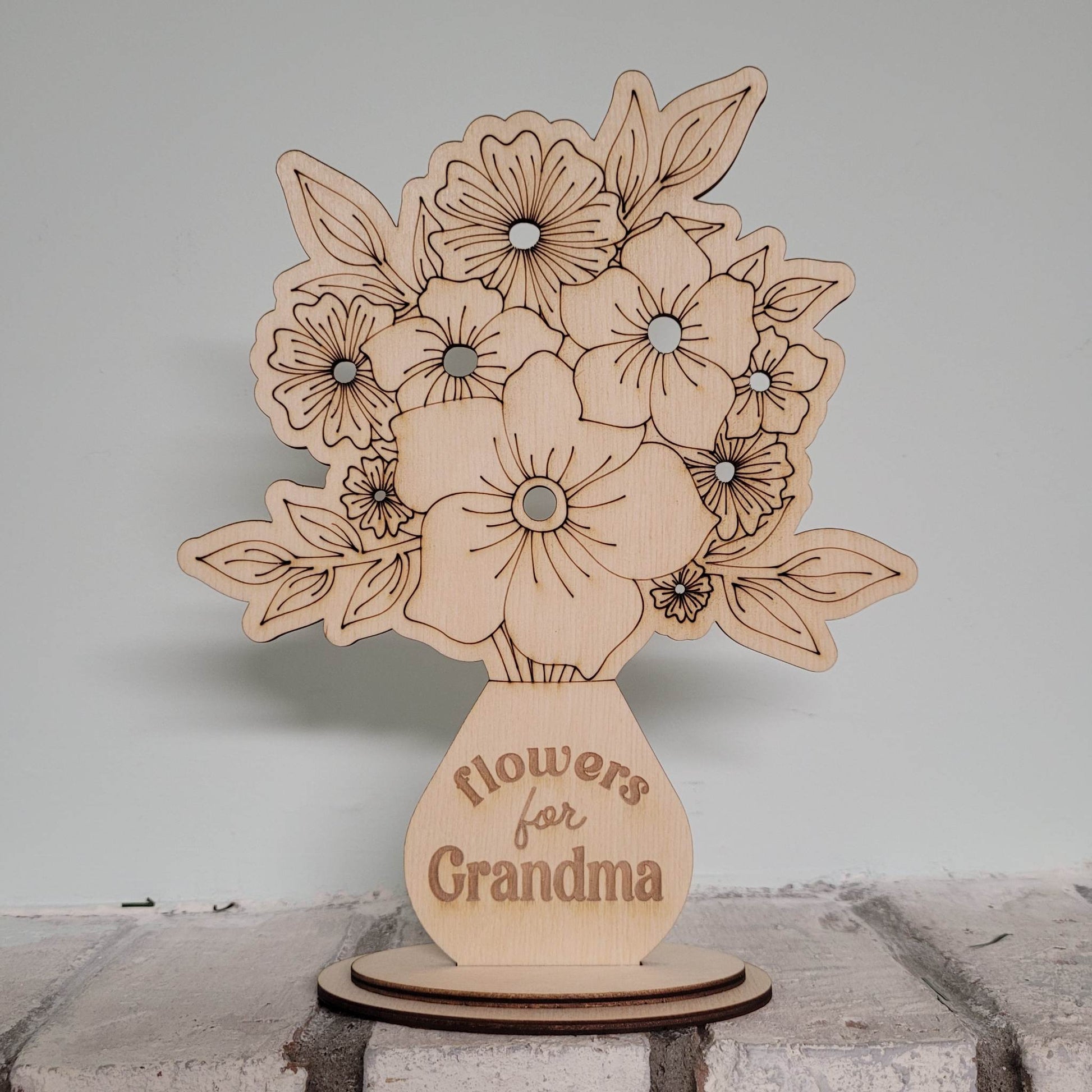 Do you have a kiddo who is always picking flowers? Let them make a whole bouquet with this cute holder! It is laser cut and engraved from 1/8” Baltic birch and fits easily in small hands. Your kiddo can even paint the vase before adding flowers to make a beautiful keepsake that they can use over and over with every new batch of flowers. Measures approx 7.5" x 9"