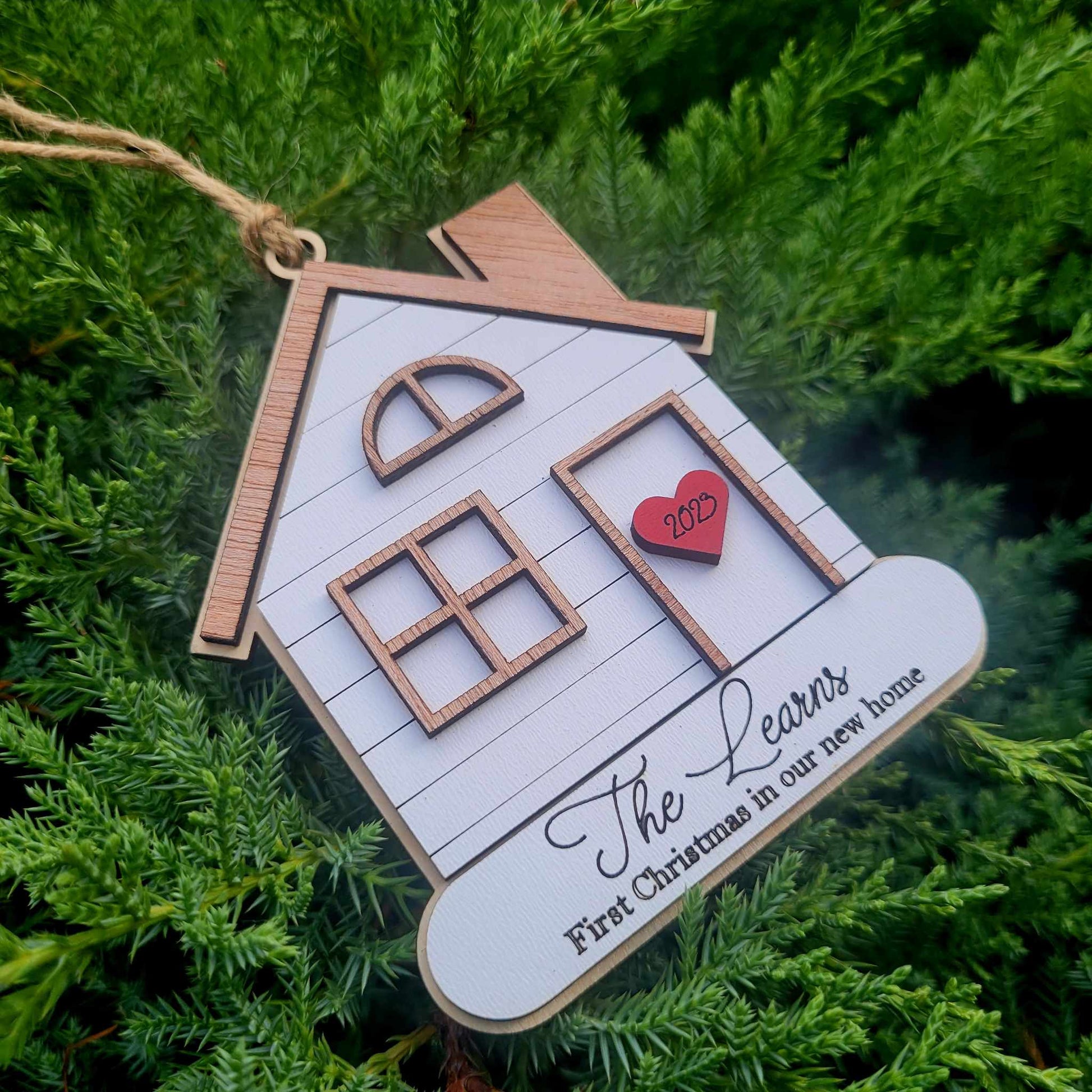 Celebrate your new home in style with this one-of-a-kind ornament! This features 5 sayings to choose from including a customizable last name option and is perfect for your first Christmas in your new abode. Each house measures approx 4.25 x 4.75" and is made with baltic birch and mdf.