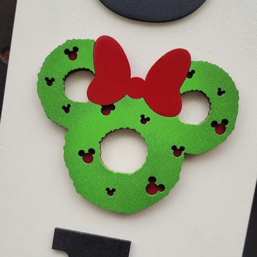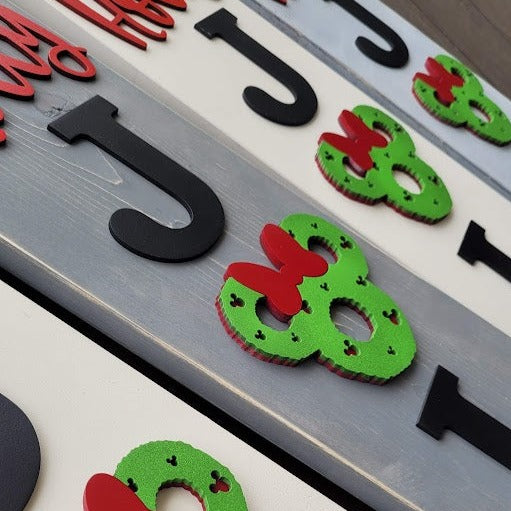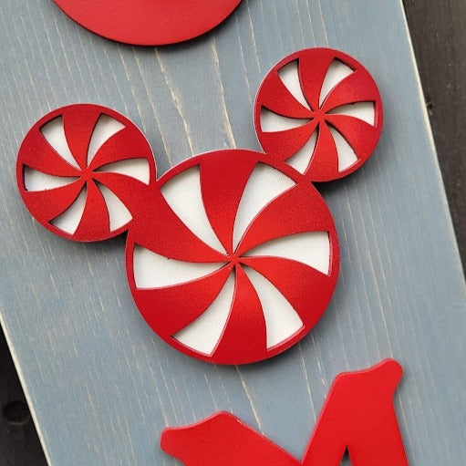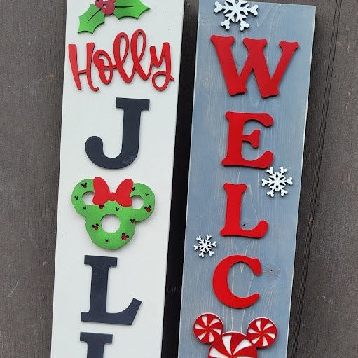 Add some playful flair to your front door with our porch leaners inspired by a certain mouse. Each piece is made on real wood and features laser-cut 3D elements, measuring 4 feet in height. Like our Home Collection signs, the interchangeable mouse heads add a whimsical touch. Each learner comes with the head shown; additional heads can be purchased on our website.