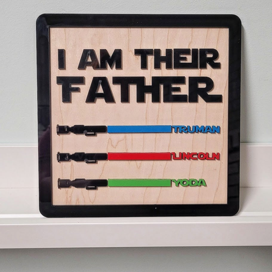 The perfect custom gift for that Star Wars-loving Dad in your life! This piece is made with Canadian maple and framed with black acrylic. Each sign measures 9x9, comes with a stand or hanging hardware attached to the back. Signs with one child can have a picture clip added, free of charge, due to the size and space.